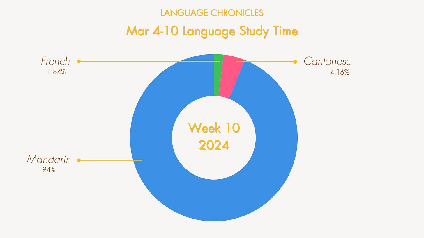 I completed one pronunciation lesson in French and one Cantonese lesson. I did watch a beginner level Cantonese video on YT. I have pushed this weekβs plans to next week (week 11).