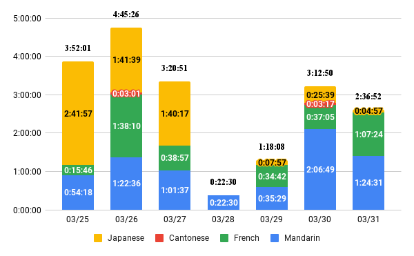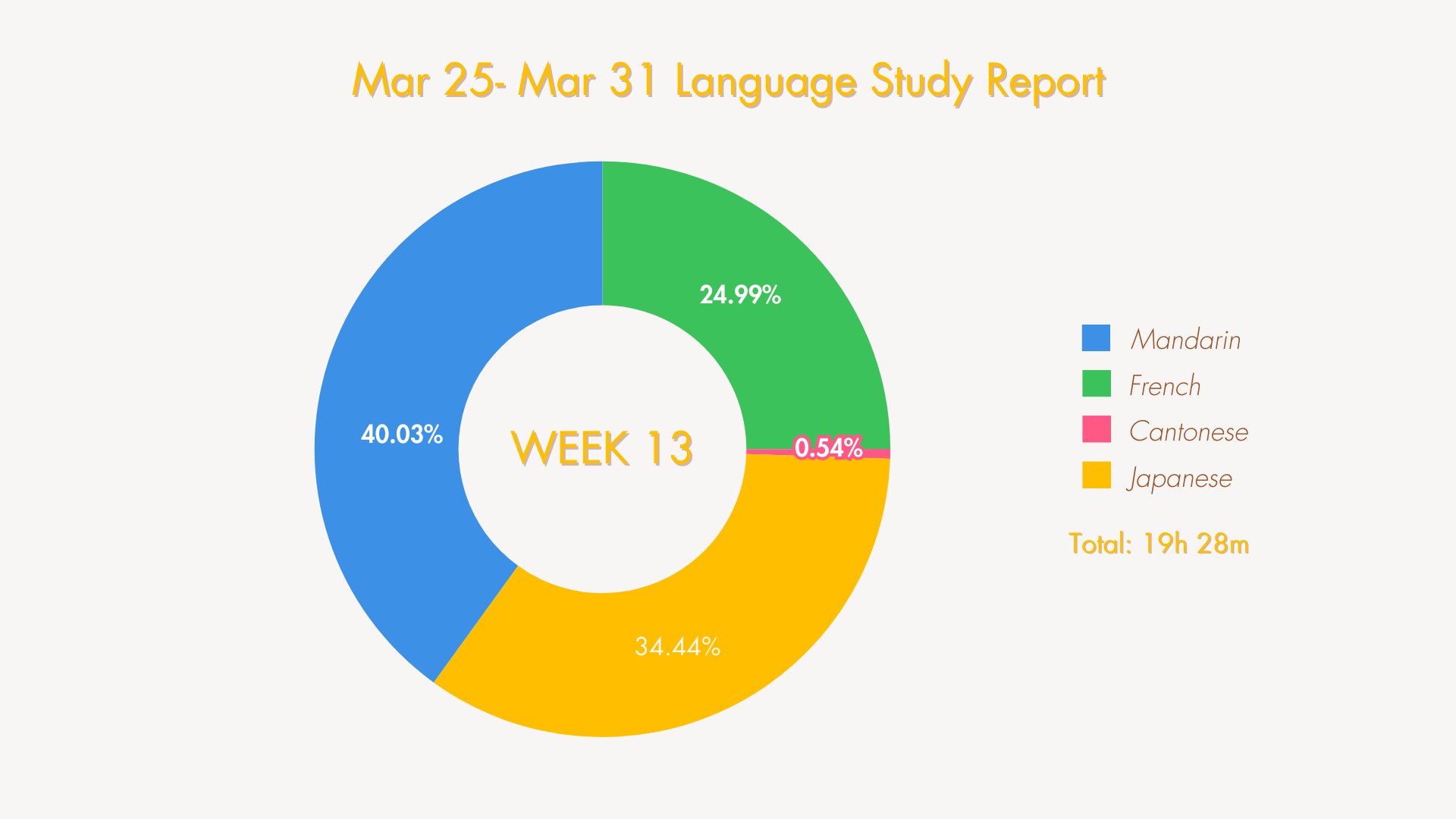 I listened to 2 to 3 podcast eps and wrote 2 journal entries. The rest of the time I did immersion watching native content while having meals throughout the week. One thing I am glad I did was record my myself reading a text in chinese. I listened to it and there were parts that sounded great like the tones and everything and it is made me so happy.